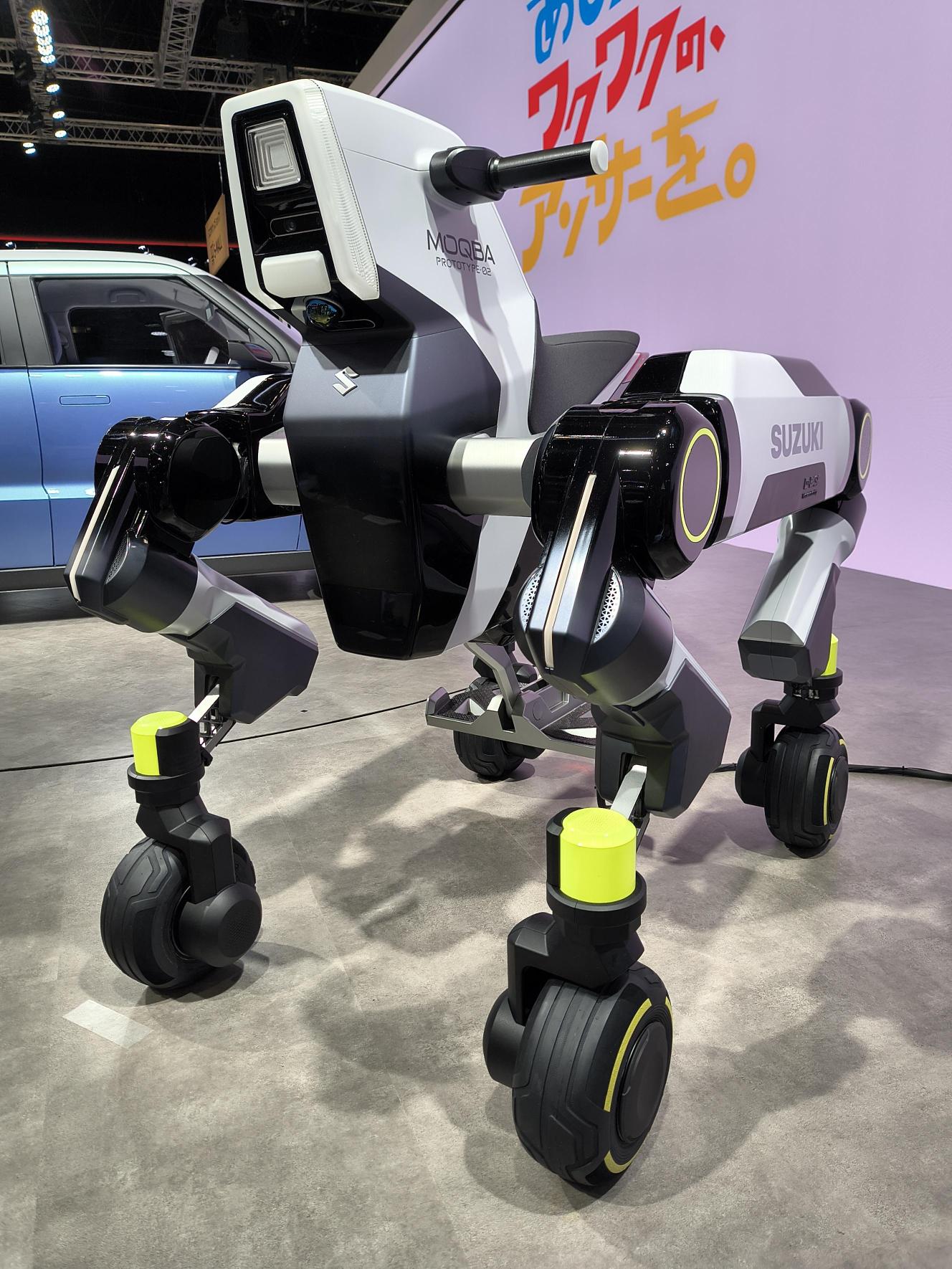 四足歩行ロボットの足先に車輪が付いており、平坦路は車輪で、段差のある箇所は足で動く次世代モビリティです。