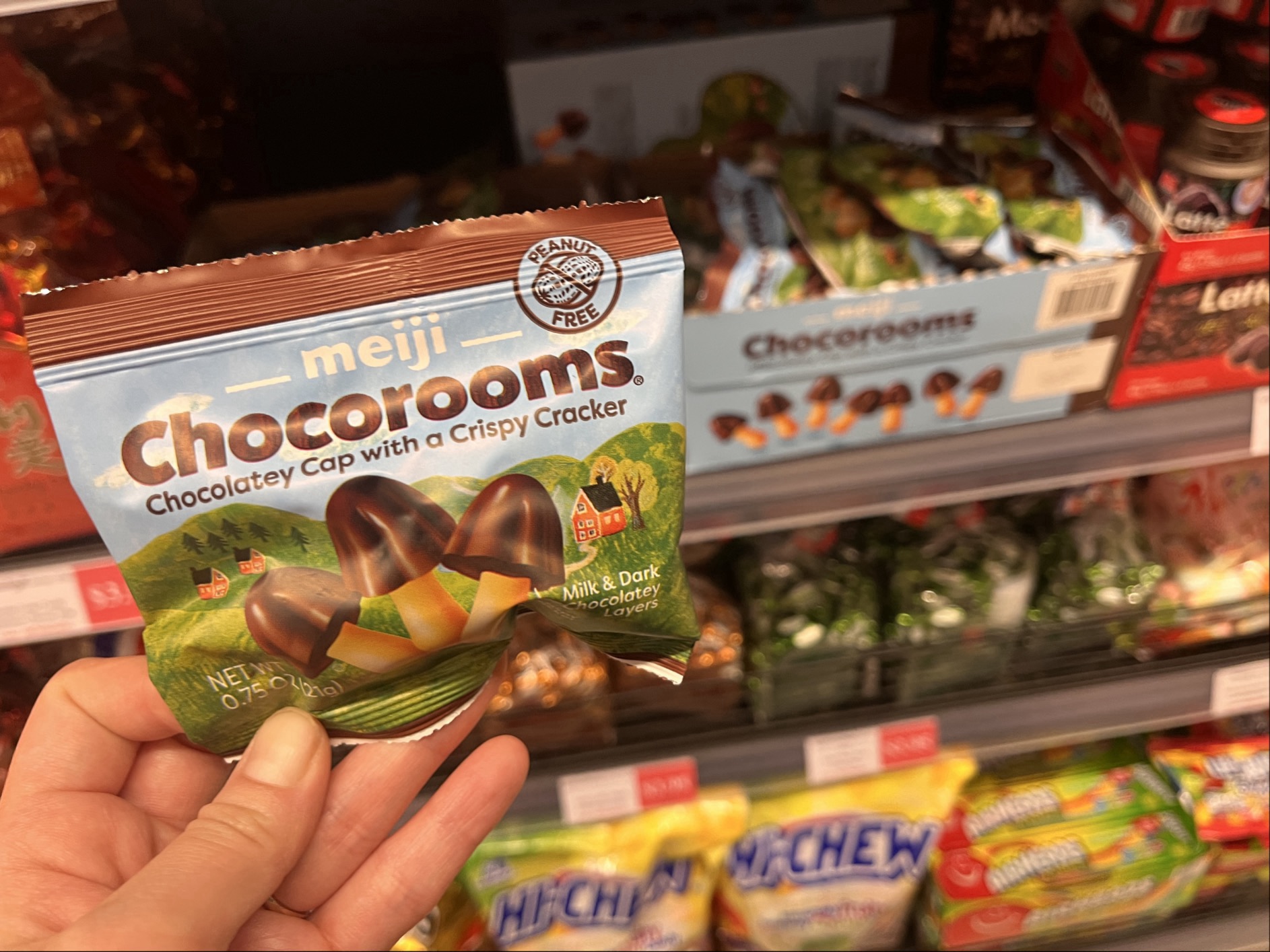 スーパーで見かけた、おなじみの「きのこの山」。